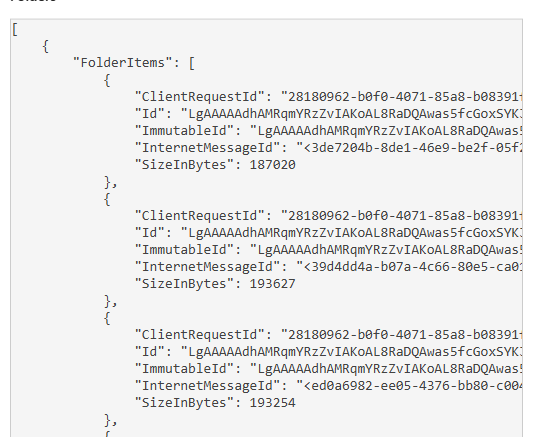 Since this was a batched export, the ClientRequestId remains consistent across all entries that where included in the same batch. Another key piece of information here is the ImmutableId, which enables correlation of the message with other related events (regardless of that item being later moved or deleted).