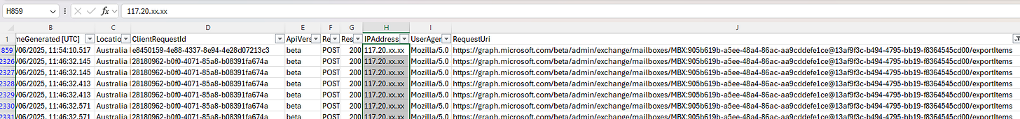 An advantage of the Graph activity logs over the unified audit logs is it captures the actual initiating client's IP address for each request (in the unified audit logs for exports it shows the Graph servers as the clientIP), along with a wealth of additional information that aids in correlating with specific sign-in events. Furthermore, you can also track any related events in the admin/exchange/mailboxes/ namespace which can be CRUD operations on folders or item enumerations which if they are being performed should also be monitored and investigated where necessary.