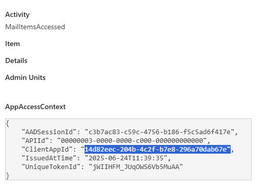 The primary purpose of this MailItemsAccessed event is for post-mortem analysis: to identify what a malicious actor may have accessed. Therefore, the expectation is that you would first identify the Service Principal used by the compromised entity, and then query the audit logs to determine which items were accessed. From this, you can then infer whether those items were exported, scanned, or subject to other actions.